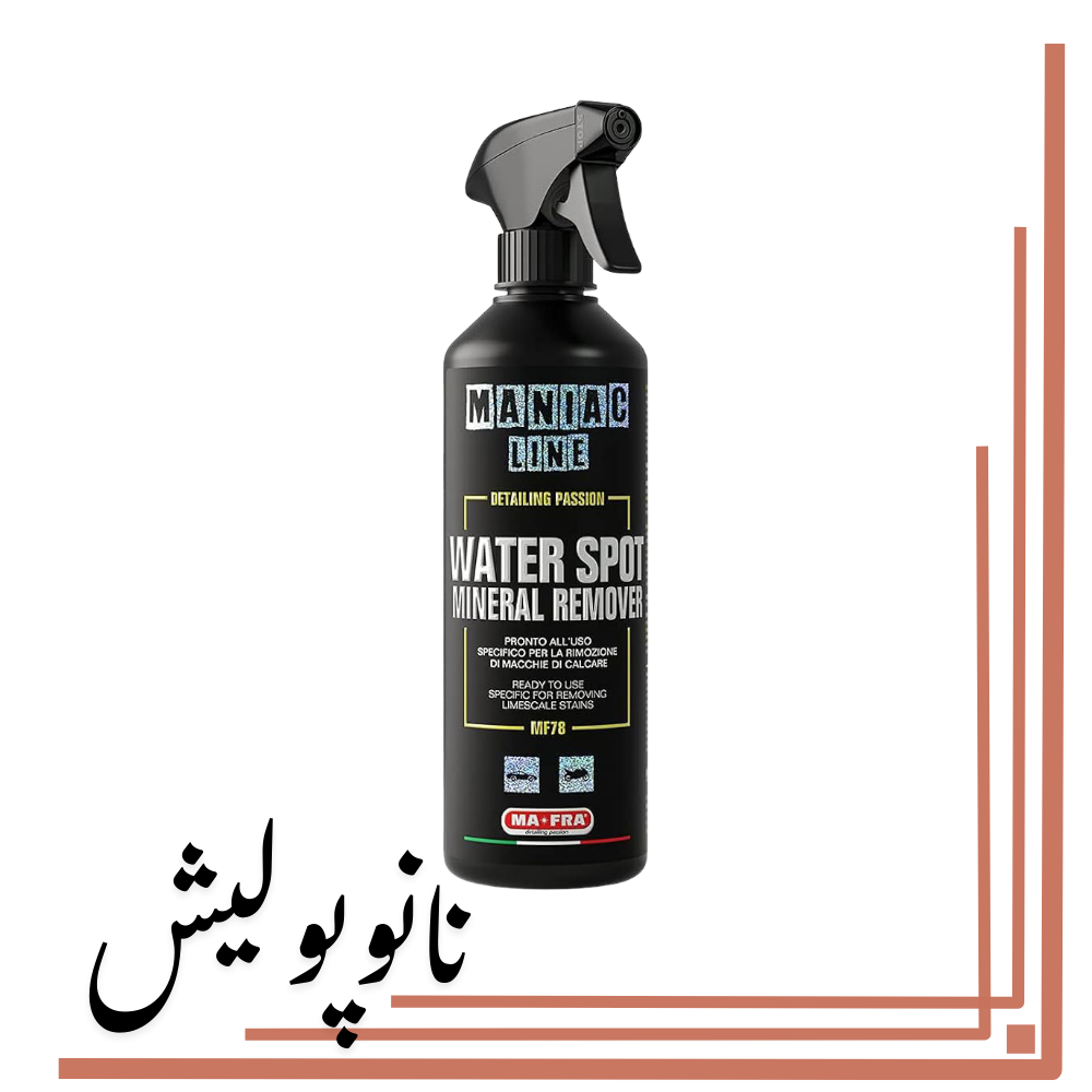 پاککننده لکه آب و رسوبات معدنی مانیاک مفرا (Mafra Maniac Water Spot Mineral Remover MF78) یک محصول تخصصی برای از بین بردن رسوبات آب سخت، لکههای آب، اثرات باران اسیدی، و سایر آلودگیهای معدنی از روی بدنه، شیشه و سطوح مختلف خودرو است. این محصول با فرمول پیشرفته خود بدون آسیب به سطح رنگ یا پوششهای محافظ، لکههای سرسخت آب را بهطور مؤثر حل کرده و پاک میکند.