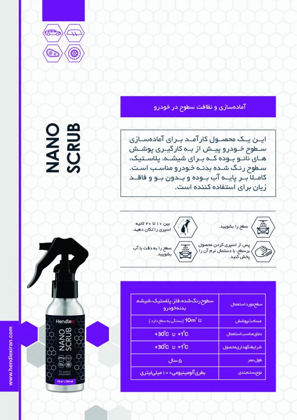 اسپری پاک کننده ی سرامیک بدنه ی خودروی هندلکس HENDLEX NANO SCRUB یکی از منحصر بفردترین محصولات کمپانی هندلکس می باشد. یکی از دغدغه های مهم همه دیتیلرها، اثر لک شدن سرامیک روی بدنه ی خودرو می باشد. گاهی در هنگام اجرای پوشش نانو سرامیک روی بدنه ی خودرو، بعلت عدم پاک کردن به موقع سرامیک از روی سطح، لک هایی ایجاد می شود. این لک ها باعث دو رنگ دیده شدن سطح بدنه می شود. برای از بین بردن این لک ها، می بایست سطح را دوباره پولیش کنید. اما با استفاده از اسپری پاک کننده ی سرامیک بدنه ی هندلکس براحتی می توانید این لک ها را بدون پولیش کردن خودرو، پاک کنید.