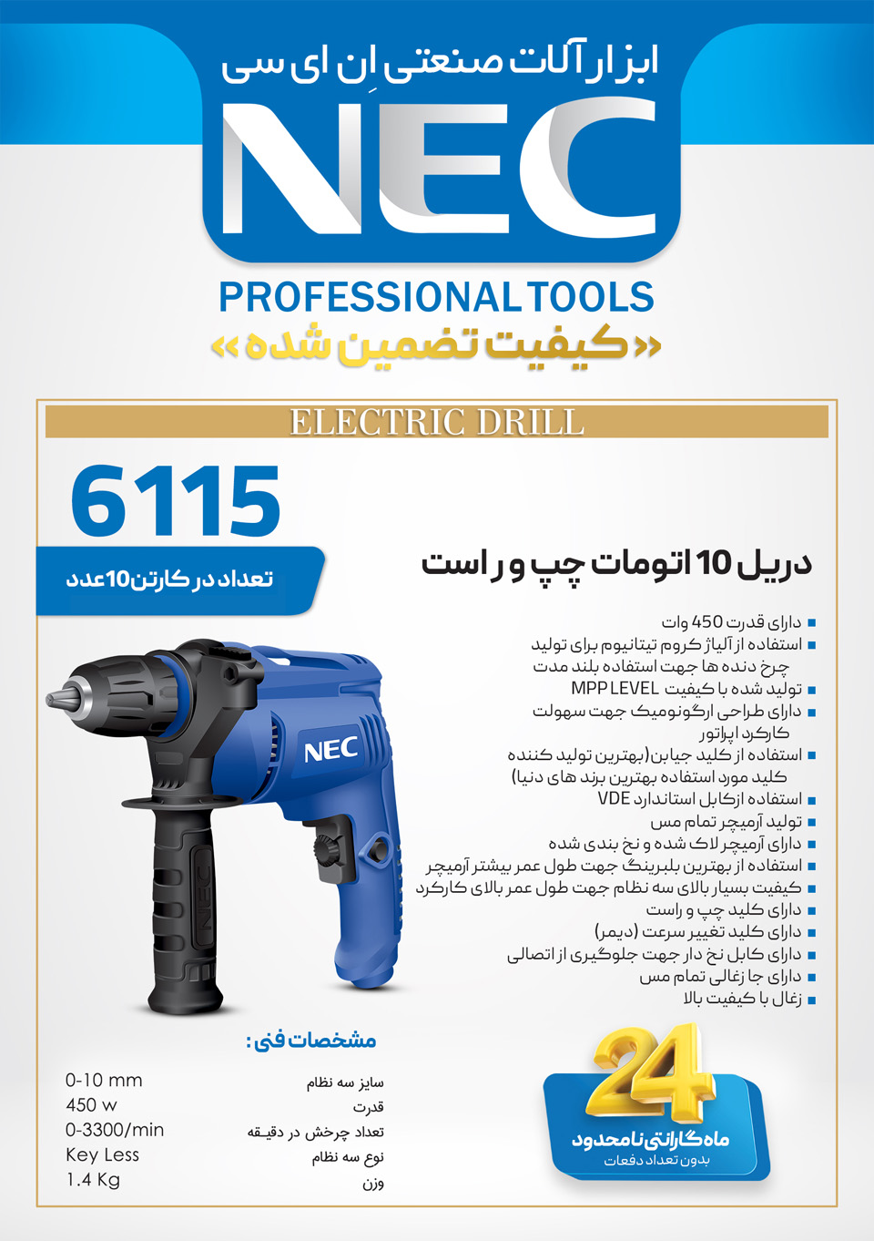 دریل 10 اتومات چپ و راست 450 ولت ان ای سی می تواند انتخاب ایده آلی برای شما صنعتگران حرفه ای باشد، چرا که محصولات برند ان ای سی دارای 24 ماه گارانتی نا محدود هستند و شما می توانید خریدی مطمئن داشته باشید.